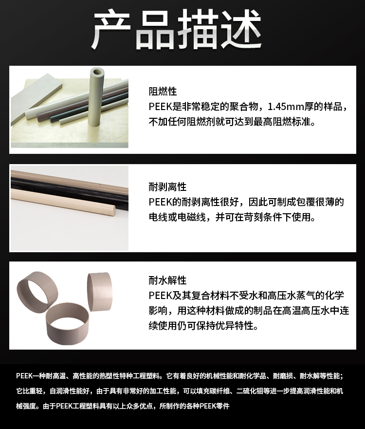 PEEK(聚醚醚酮)是一種耐高溫,高性能的熱塑性特種工程塑料。它有著良好的機(jī)械性能和耐化學(xué)藥品性、耐磨損、耐水解、比重輕、自潤滑性嫩性能好;由于具有非常好的加工性能,可以填充碳纖維、二硫化鉬等進(jìn)一步提高潤滑性能喝機(jī)械強(qiáng)度。此外,PEEK還有另外三種不同級別材料:PEEK-GF30、PEEK-CA30、PEEK-HPV等材料!