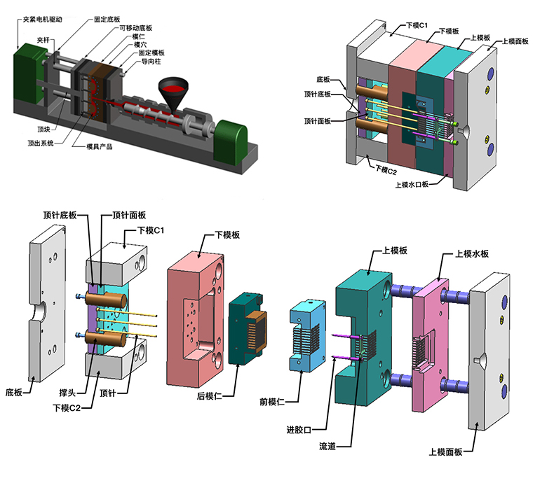 塑料顆粒被裝入注塑機的一個桶中,在桶中通過高溫最終被熔化,壓縮,并注入模具的流道系統(tǒng)。熱樹脂塑料通過澆口射入模腔,模具成型。模具中的頂出銷將零件從模具中頂出,使其落在裝料箱中。
